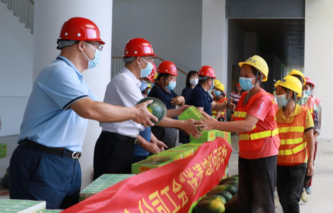 在项目现场,慰问组一行与项目负责人深入交流,详细了解一线职工工生产生活情况,现场查看施工安全生产、劳动保护和防暑降温措施,并送上清凉饮料等慰问品。