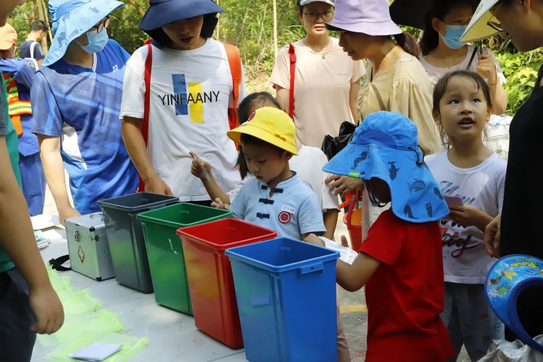 参与人员徒步上山时捡拾路道边散落的垃圾,并在到达终点后,将捡拾到的垃圾分类投放到现场的垃圾桶内