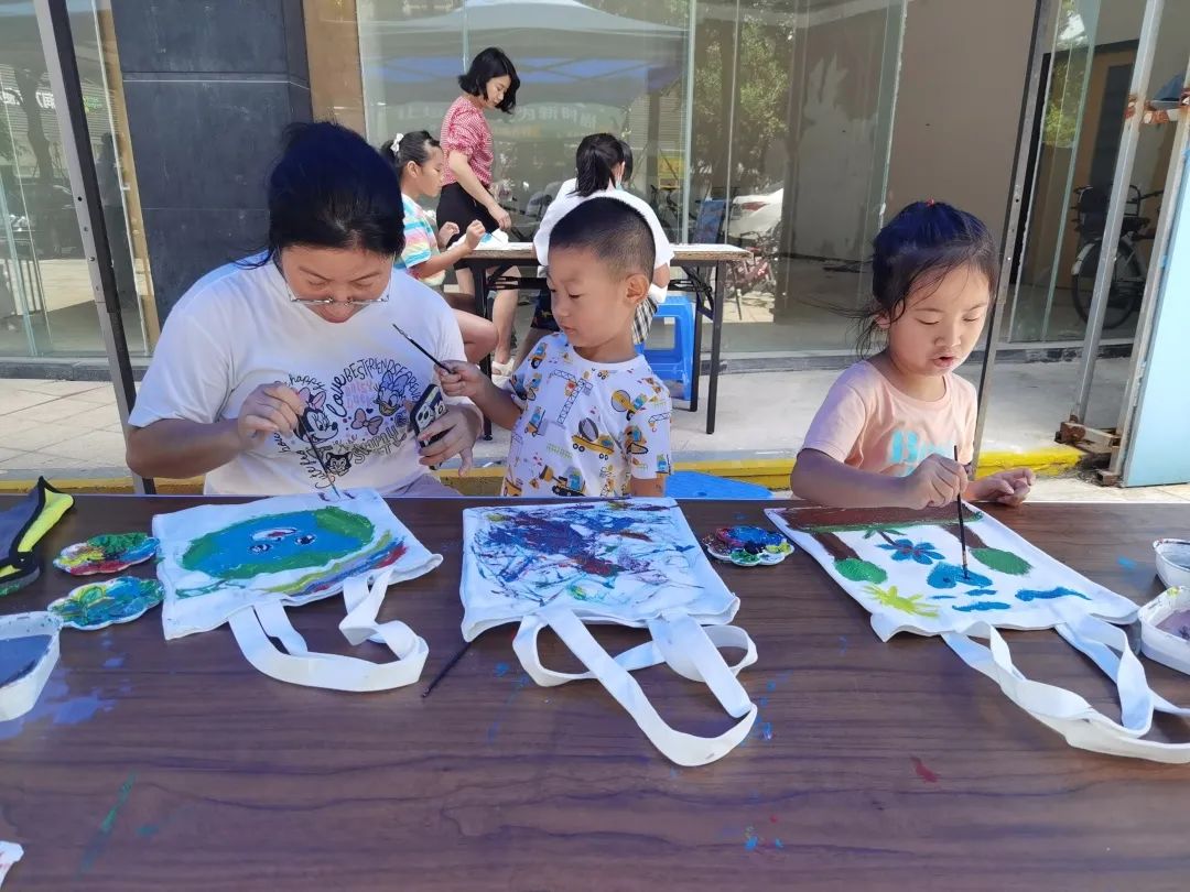 居民用手中五颜六色的颜料,对单调的环保袋进行拓印,赋予环保袋新的面貌