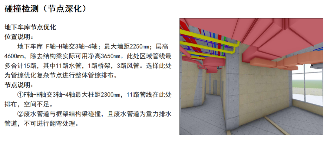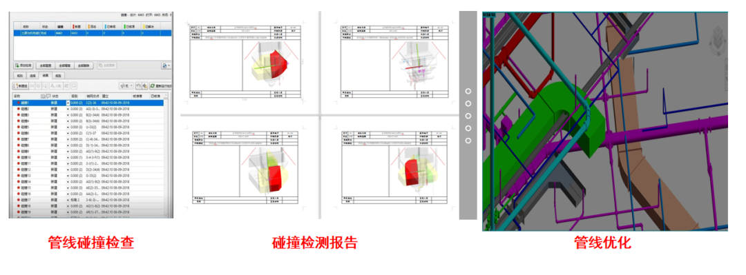 对综合楼区域的机电模型进行专业间的碰撞检测,导出碰撞检测报告并进行分析,结合图纸会审结果,进行机电管线综合优化。本次项目共优化329余处,解决机电碰撞点329处,解决净高问题53处。