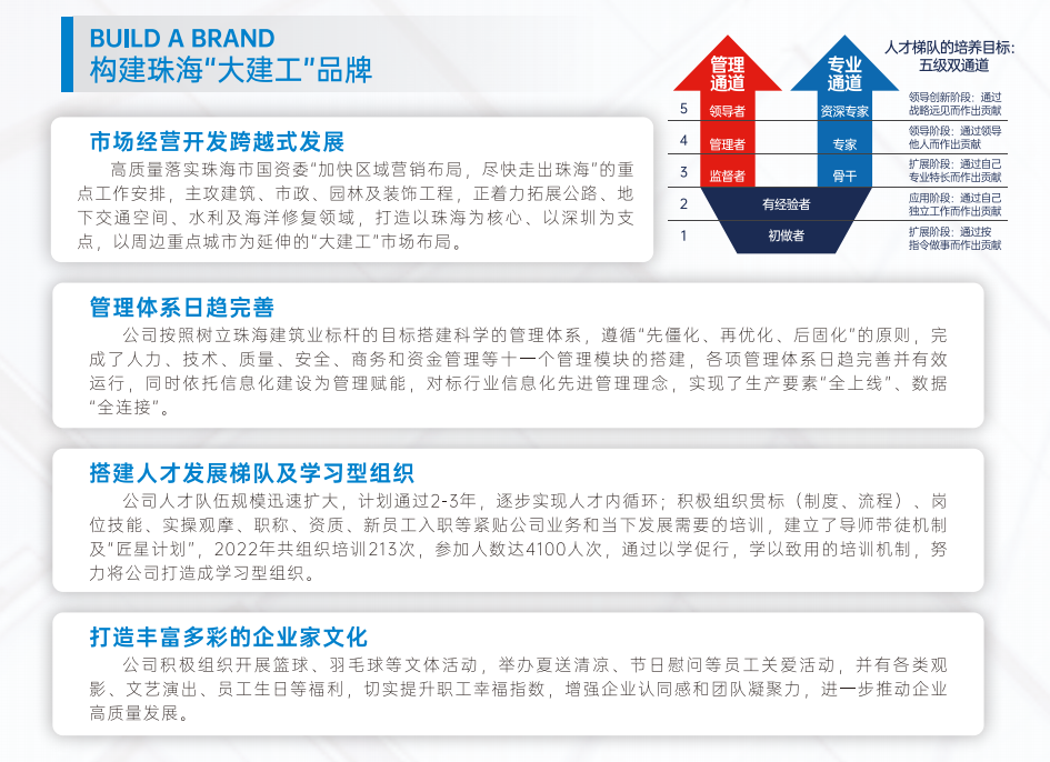珠海建工集团自正式运营以来,通过短短两年时间的精心谋划、积极应对、主动作为,业务承揽量实现了从拾亿级到百亿级的突破,主要经营业绩实现了质的提升,资产规模和人才队伍也呈十倍级地迅速壮大,更荣获了“AAA信用企业”、“高新技术企业”等一项项殊荣。也在高质量发展的征程中,锤炼锻造了一支堪当重任的干部队伍。
