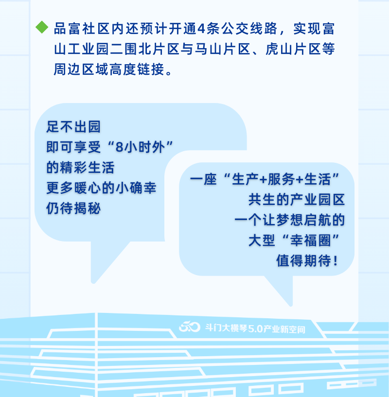 新空间,托起产业新梦想。作为一座能“拎机投产”“拎包入住”的高质量园区,斗门大横琴5.0产业新空间不仅适应新形势、赋能新技术、承载新产业,还配备能满足员工吃、住、娱乐休闲等需求的生活、商业配套。