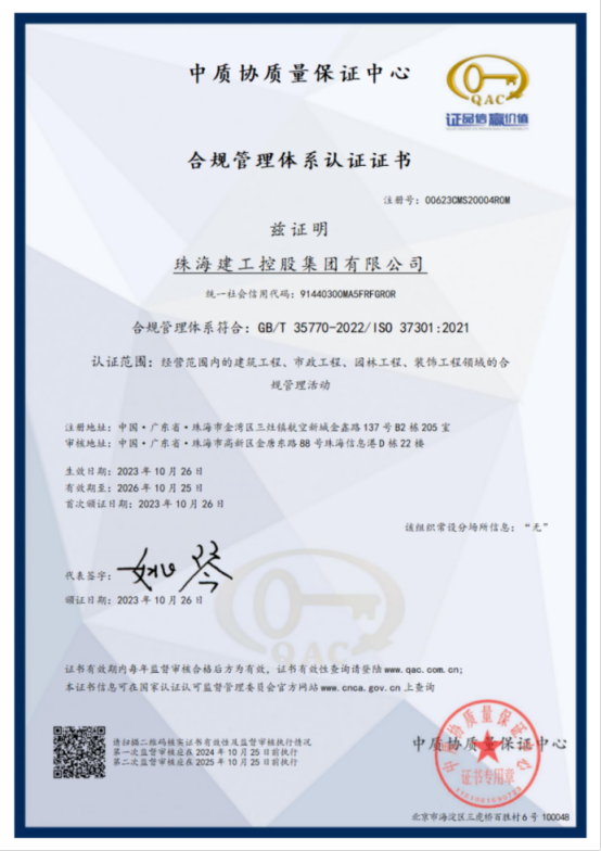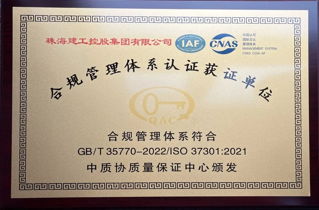近日,珠海建工集团顺利通过GB/T 35770-2022/ISO 37301:2021合规管理体系标准贯标认证,获得中质协质量保证中心颁发的双标认证证书。合规筑基、行稳致远,珠海建工集团在法治治企的征程上迈出了坚实的一步。