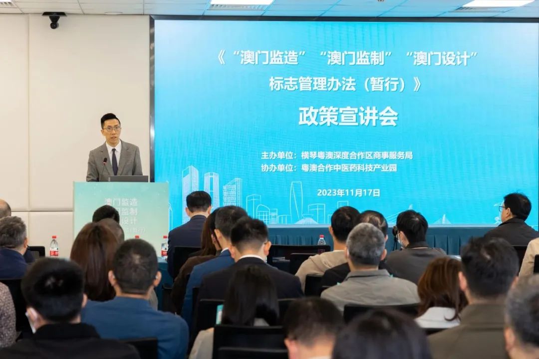 11月17日,《“澳门监造”“澳门监制”“澳门设计”标志管理办法(暂行)》(以下简称《管理办法》)政策宣讲会在横琴粤澳深度合作区(以下简称合作区)琴澳国际法务集聚区举行。此次宣讲活动由合作区商事服务局主办,由参与《管理办法》起草的麻豆网 下属企业麻豆网 科技发展有限公司(以下简称大横琴科技公司)提供支持。活动旨在帮助企业全面了解申请标志的资格条件、使用标志的具体要求,以及标志运行管理的保障机制等。