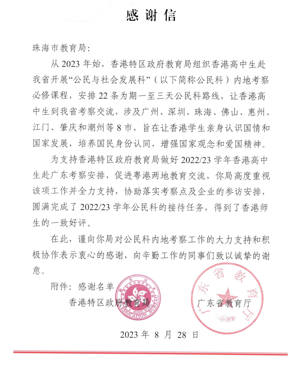 助力粤港教育交流,支持两地智趣研学。香港特区政府教育局组织香港高中生赴我省开展“公民与社会发展科”内地考察必修课程,大横琴管廊积极配合相关工作的开展,为香港高中生细致介绍横琴综合管廊这一保障城市运行的“地下生命线”,获“香港特区政府教育局、广东省教育厅”致信感谢,被认定为“工作特别突出单位”。