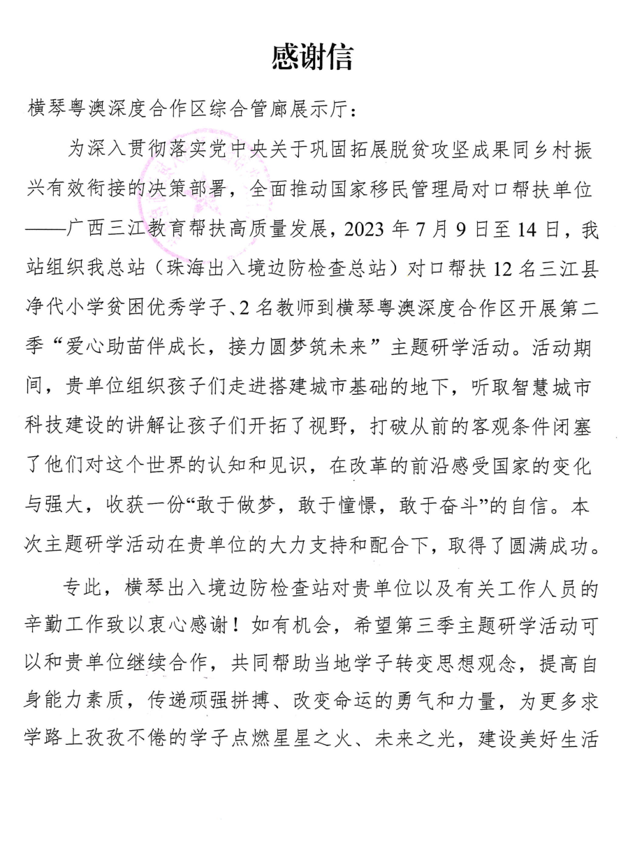 积极协助横琴出入境边防检查站的“爱心助苗伴成长,接力圆梦筑未来”活动,从云端到地下娓娓介绍,帮助优秀三江学子感知国际化都市的发展脉搏,了解智慧城市的科技建设,得到横琴出入境边防检查站和参观学子的肯定和感谢。