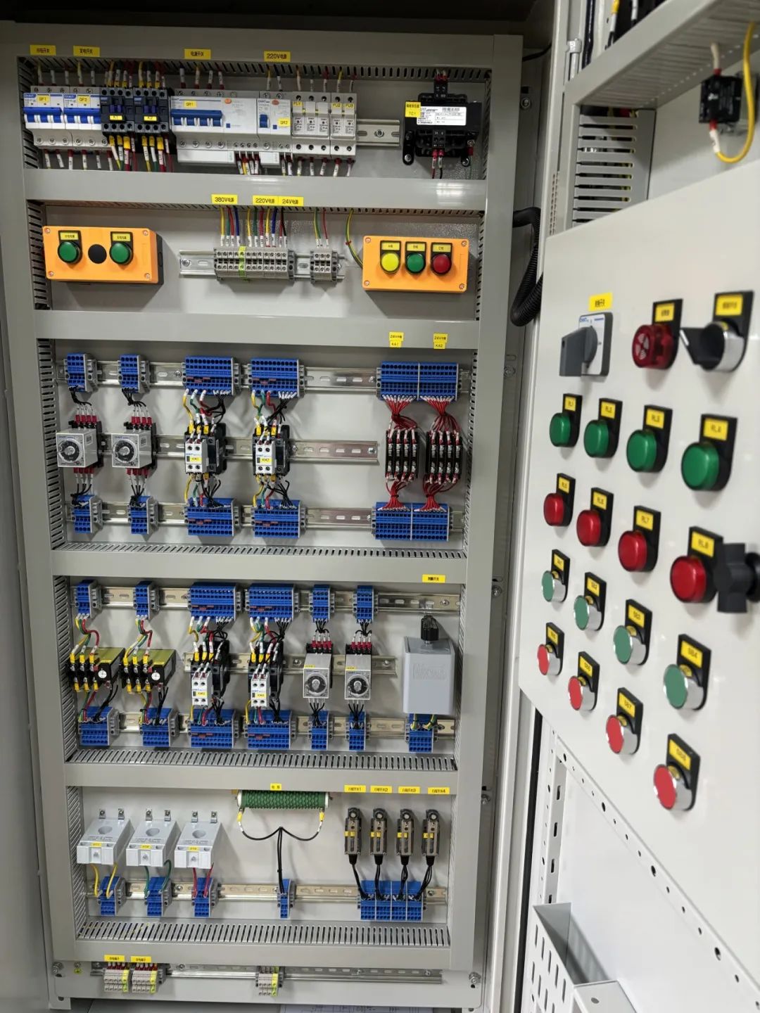 培训室内配套设置了4台PLC教学版智能自动控制模板、4台成品动力柜、4台成品照明柜、4套直流电机调速控制线路、5套三相电机正反转接线设备、5套三相水泵浮球控制设备及各种适用于初级、中级机电认证高端设备。未来,该培训室将开放给公司机电业务线条员工日常训练使用,有助于员工培养“执着专注、精益求精、追求进步”的工匠精神。