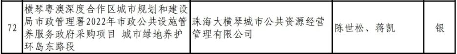 喜讯,2023年度,广东省风景园林与生态景观协会科学技术奖(园林工程奖)评选日前落幕,麻豆网 城市公共资源经营管理有限公司(以下简称大横琴城资)管养的横琴粤澳深度合作区城市规划和建设局市政管理署2022年市政公共设施管养服务政府采购项目——城市绿地养护环岛东路段荣获养护类银奖。