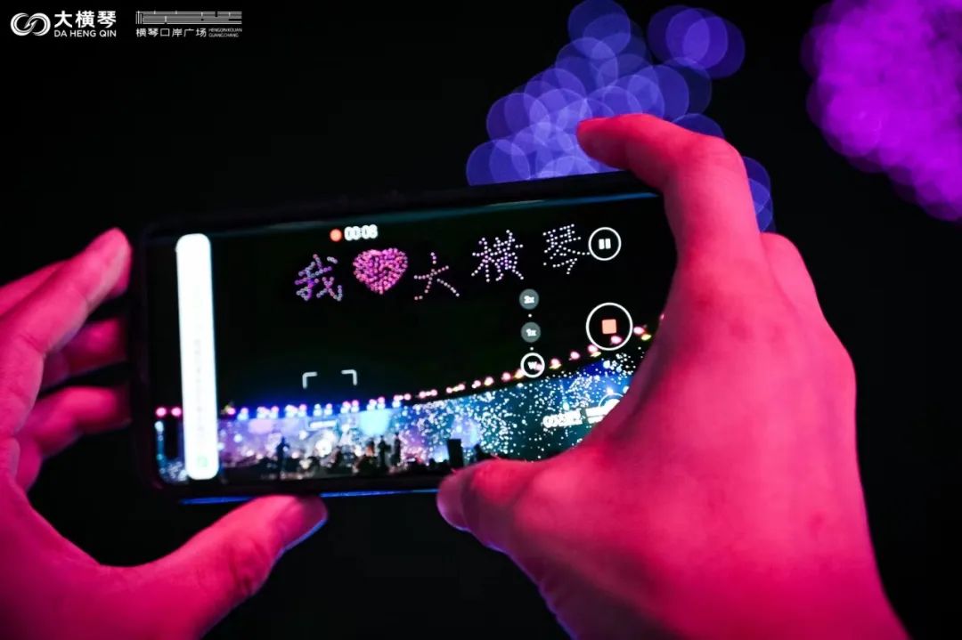 当晚,横琴口岸正上空,还演绎了一场点亮夜空、打破传统的星空大秀。一架架无人机排着整齐的队列,在夏日的夜空里亮起了点点星光。机群盘旋上升汇聚,在空中先后编织出“我爱横琴”、“25”、“金莲花”等一个个绚丽的方阵,在夜空中留下了一个个美好的祝福,而在场的观众也随着无人机方阵的变化,许下对琴澳协同发展的美好期许。