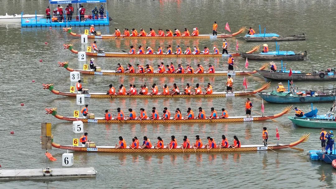 云旗猎猎,锣鼓频催。赛场上,在富有节奏的鼓声下,整齐划一的动作,奋力挥桨、劈波斩浪,河面上演着“速度与激情”。