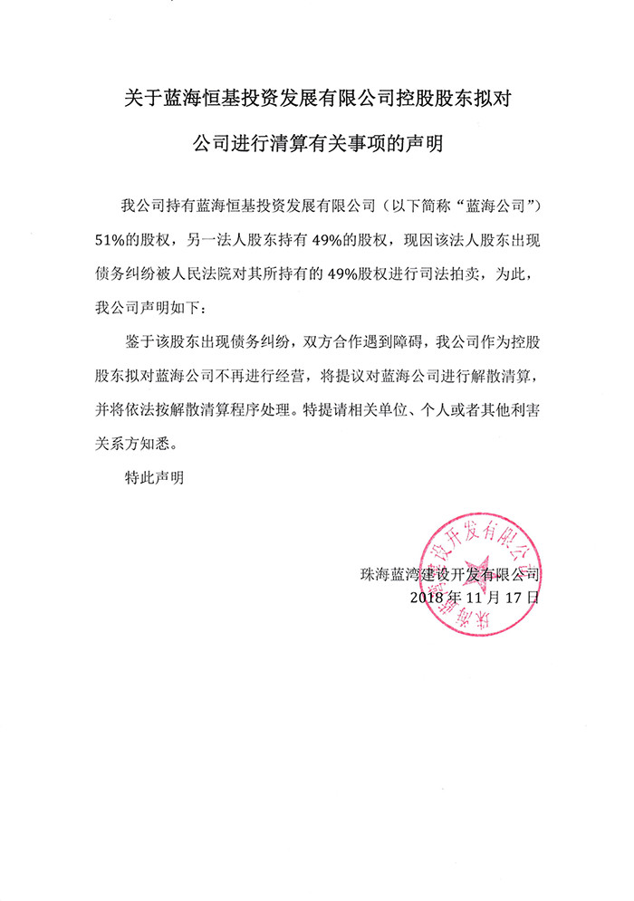 关于蓝海恒基投资发展有限公司控股股东拟对公司进行清算有关事项的声明