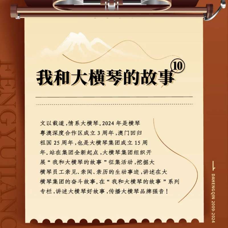 文以载道,情系大横琴。2024年是横琴粤澳深度合作区成立3周年,澳门回归祖国25周年,也是大横琴集团成立15周年。站在集团全新起点,大横琴集团组织开展“我和大横琴的故事”征集活动,挖掘大横琴员工亲见、亲闻、亲历的生动事迹,讲述在大横琴集团的奋斗故事。大横琴集团公众号将陆续推出“我和大横琴的故事”系列专栏,讲述大横琴好故事,传播大横琴品牌强音!